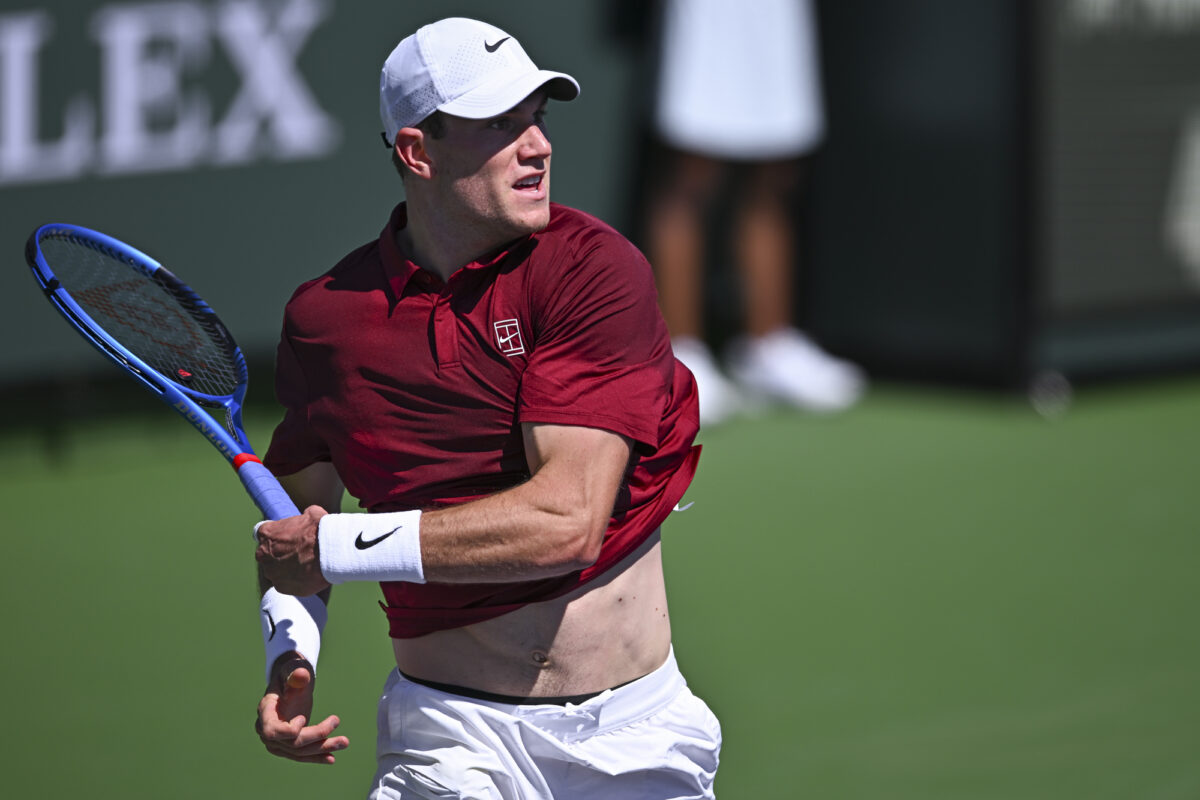 Mar 8, 2025; Indian Wells, CA, USA; Jack Draper (GBR) hits a ball against Joao Fonseca (BRA) at Indian Well Tennis Garden. Mandatory Credit: Jonathan Hui-Imagn Images